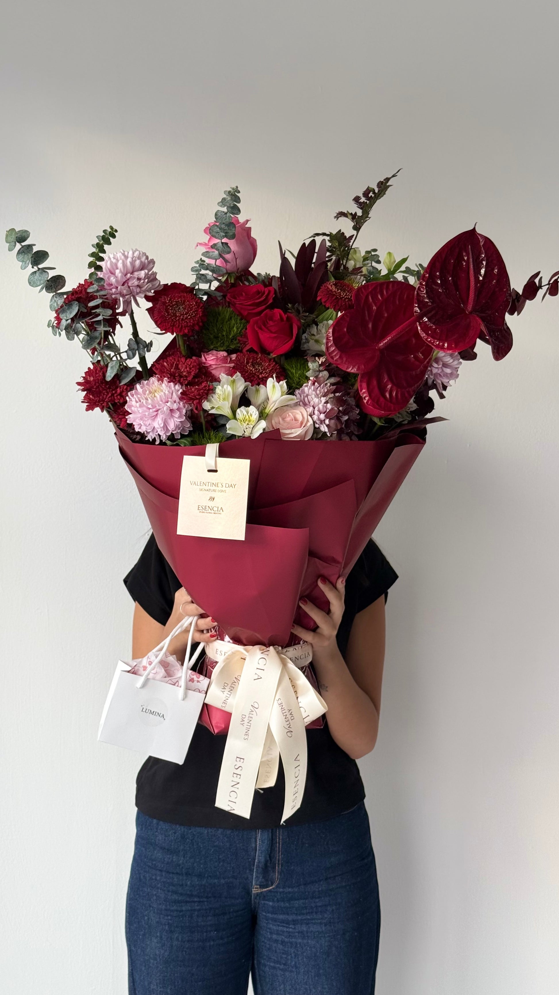Always You forma parte de nuestra colección de autor Signature Love, diseñada para celebrar el amor en San Valentín. Este arreglo en caja integra rosas, claveles, alstroemerias, roxanas, dólar natural y preservado, junto con gerberas, anturios y tulipanes, logrando una composición equilibrada, romántica y sofisticada.