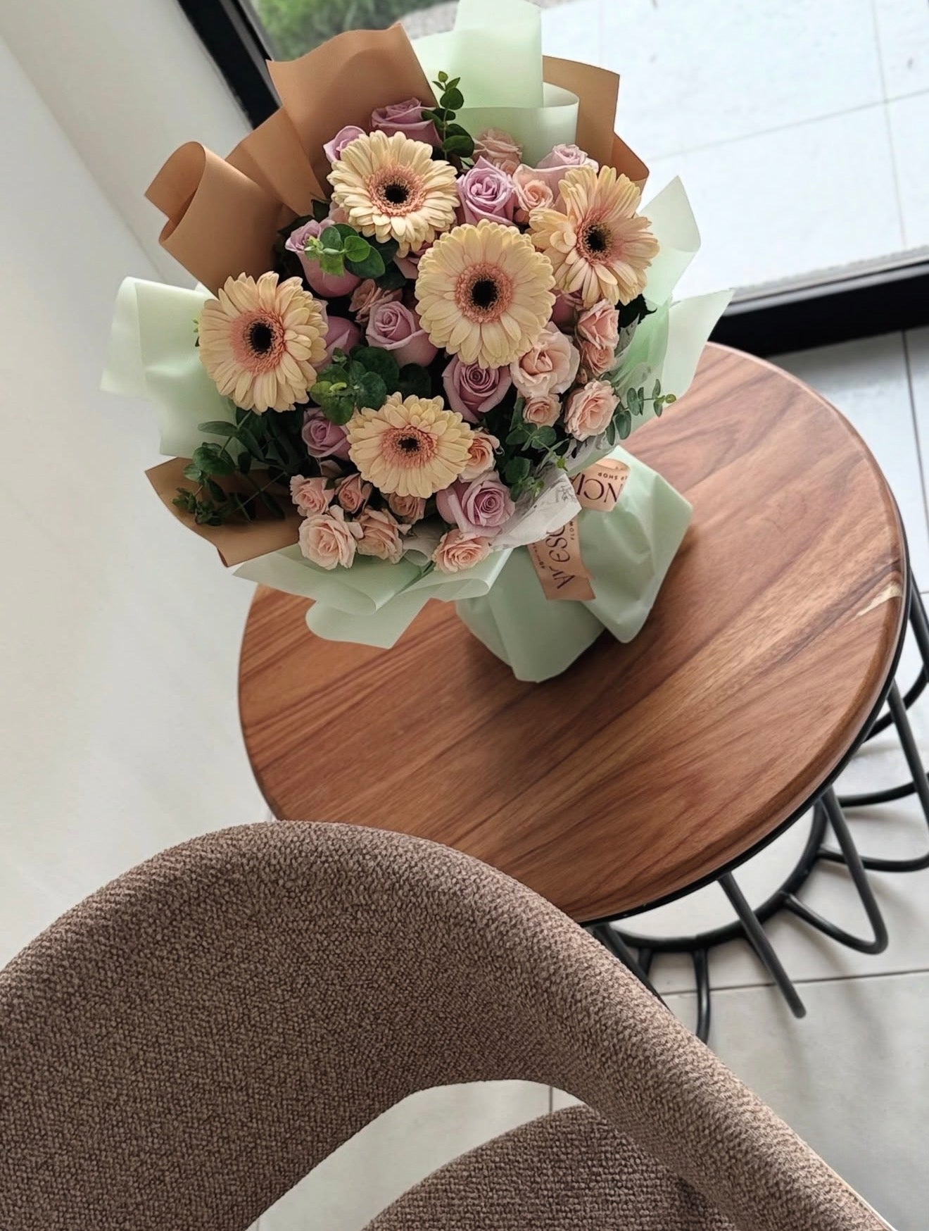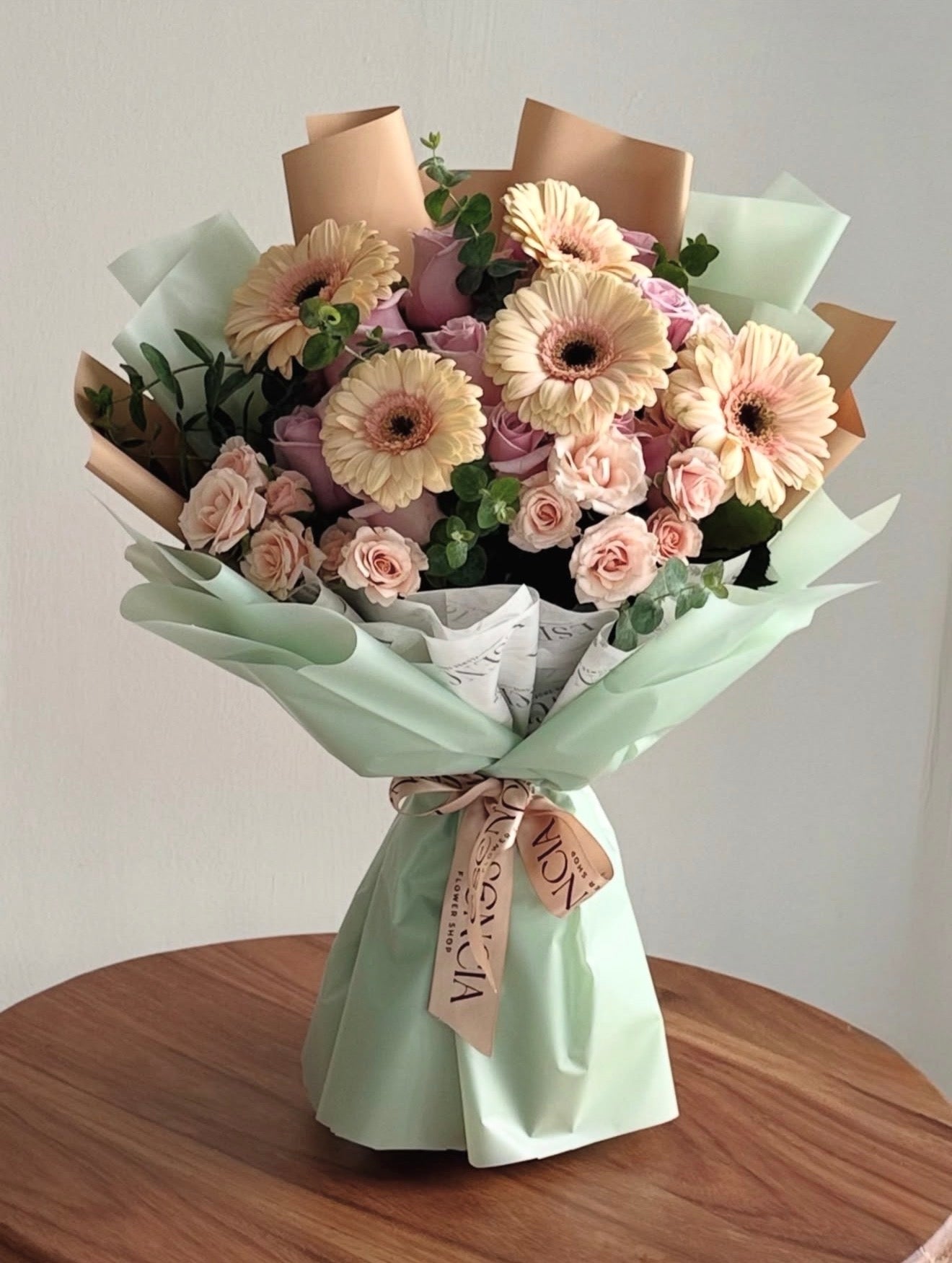 La frescura de las gerberas, la elegancia de las rosas y la delicadeza de las mini rosas se integran en una composición luminosa y editorial, creada para expresar estilo, emoción y una estética actual cuidadosamente pensada.