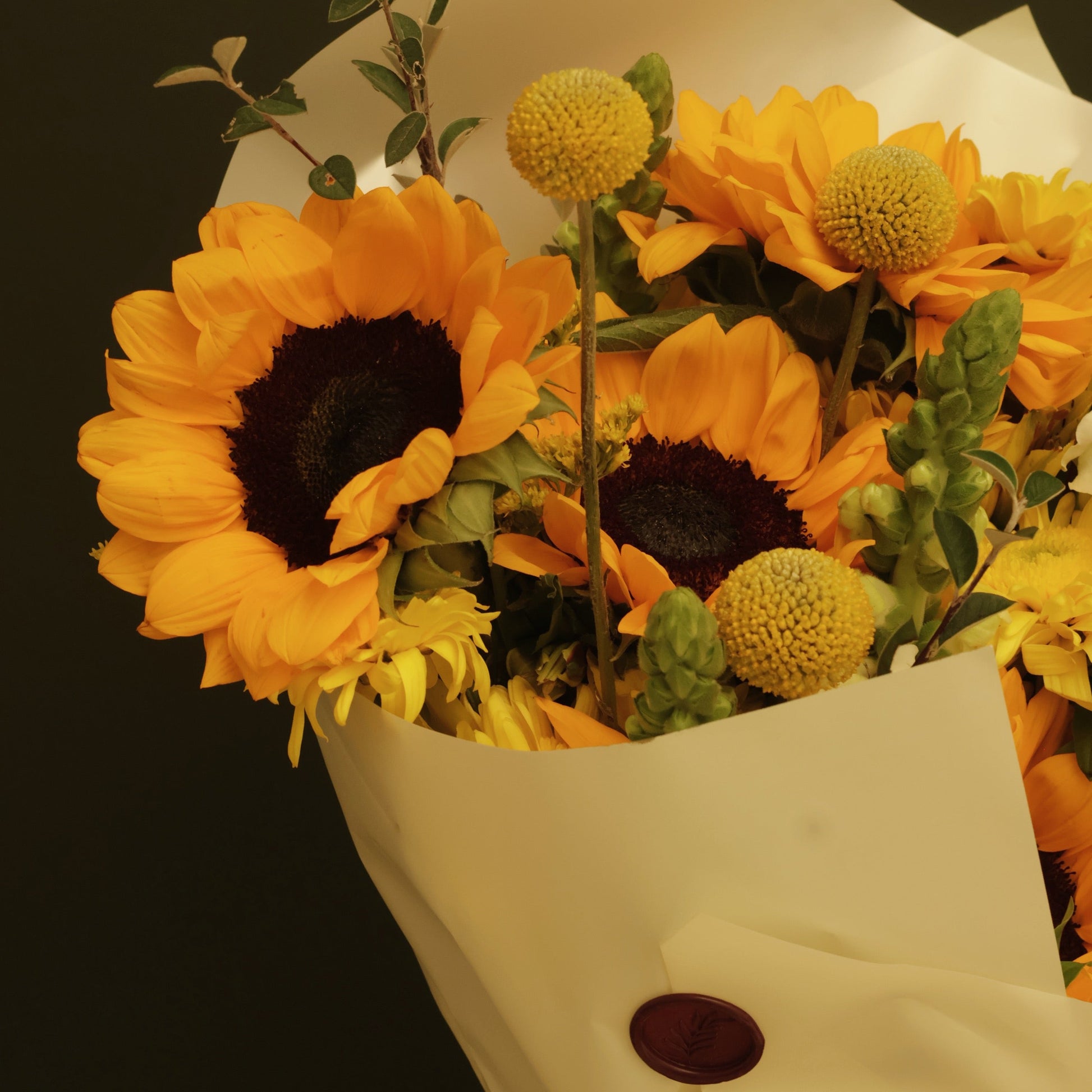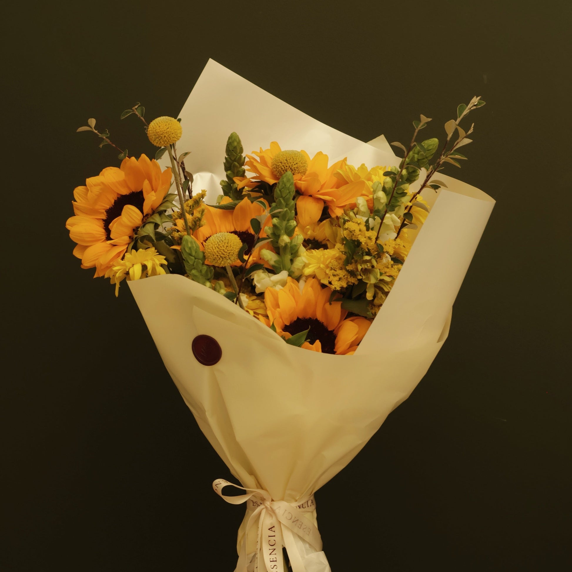 GLOW está diseñado con radiantes girasoles, delicados acentos de craspedia, flores en tonos amarillos y follajes frescos que crean una composición vibrante, elegante y llena de vida. Envuelto cuidadosamente en papel crema y terminado con el sello de Esencia, este arreglo transmite calidez desde el primer instante.