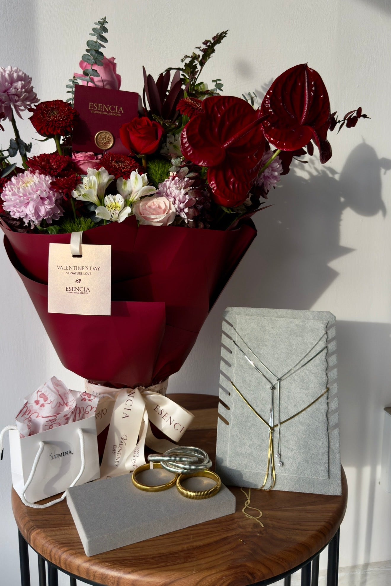 Este combo integra un ramo impactante, un collar Lumina y aretes o pulsera a elección, creando una experiencia completa de lujo emocional.