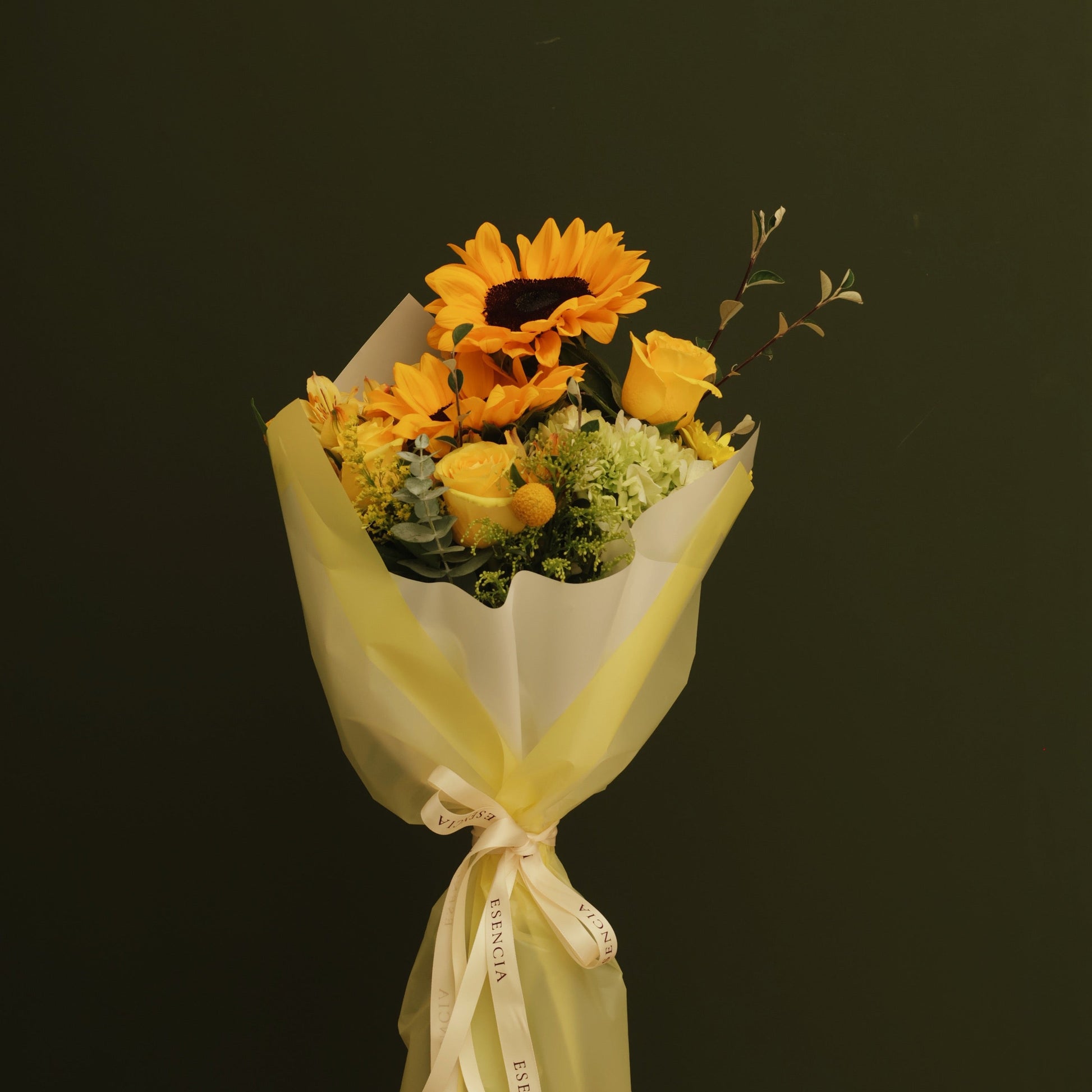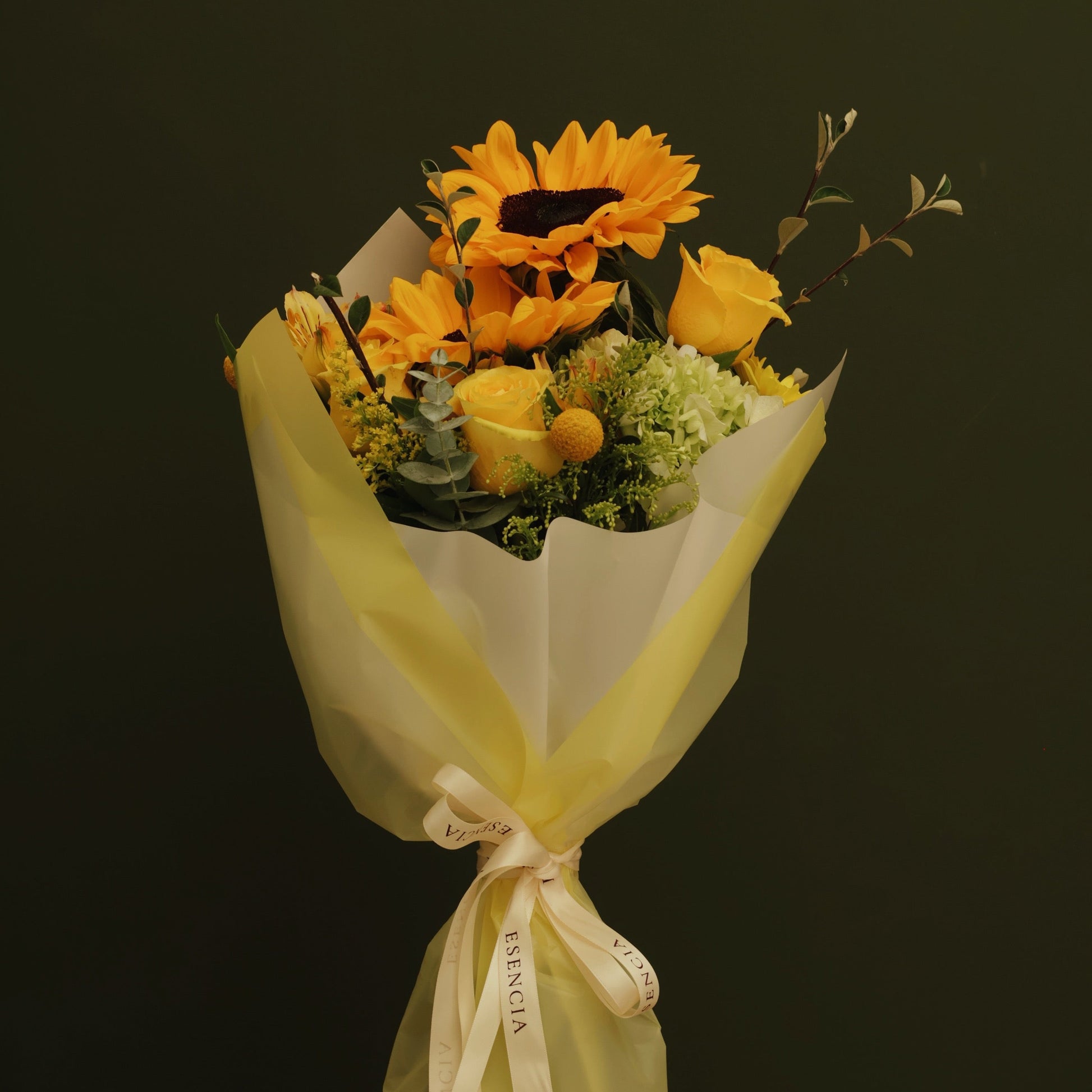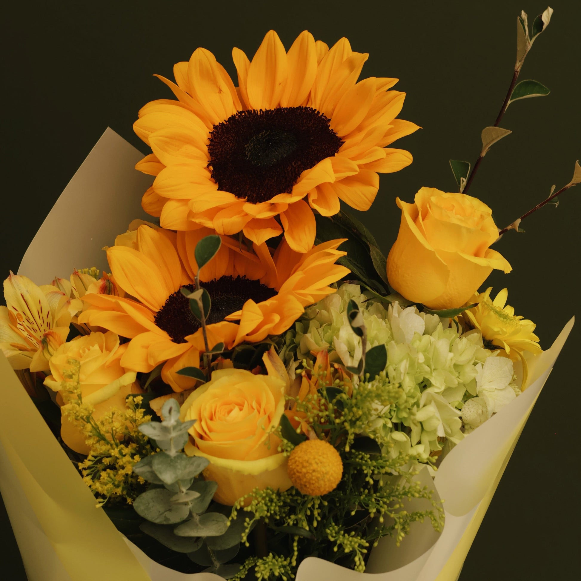 Los girasoles aportan protagonismo y alegría, mientras que las rosas y la hortensia suavizan el arreglo con un toque elegante y armonioso. Los acentos de craspedia y los follajes seleccionados completan este ramo con textura y movimiento, logrando un diseño equilibrado y luminoso.